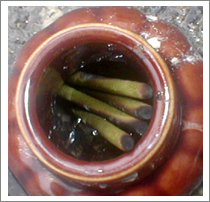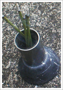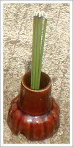 双方の線香立てに線香を入れ、燃焼後の状態と、雨水などを